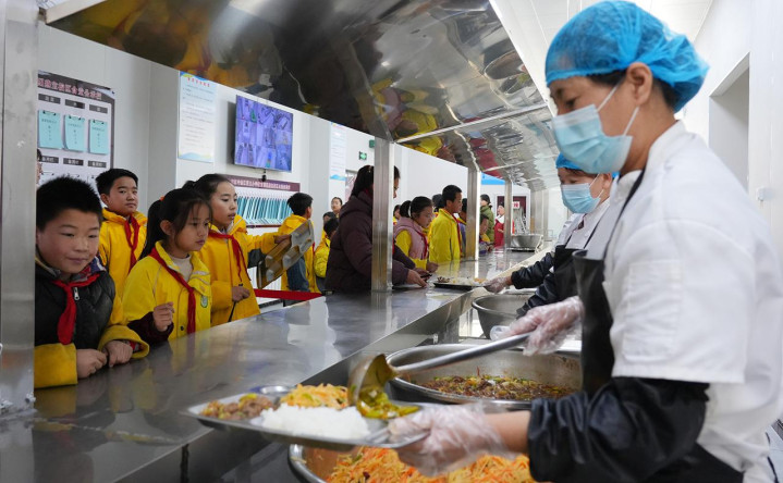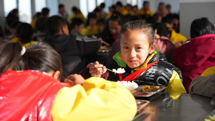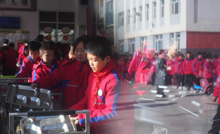 西吉县吉强镇袁河小学学生在食堂就餐。