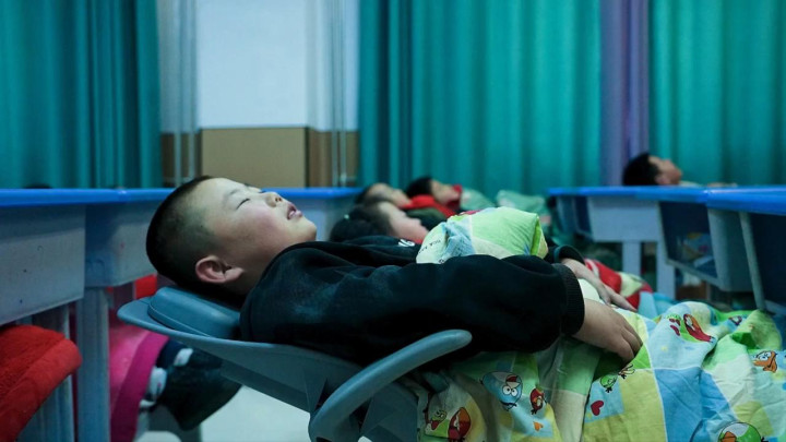 红寺堡区红海小学给学生提供了可午休的桌椅。