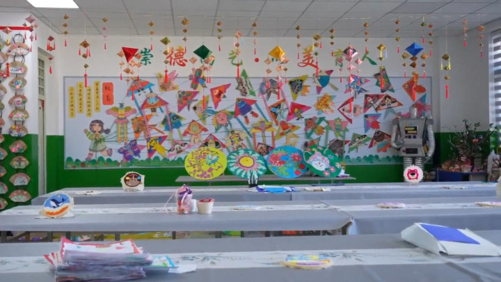 西吉三小美育教室内陈设着孩子们制作的作品。