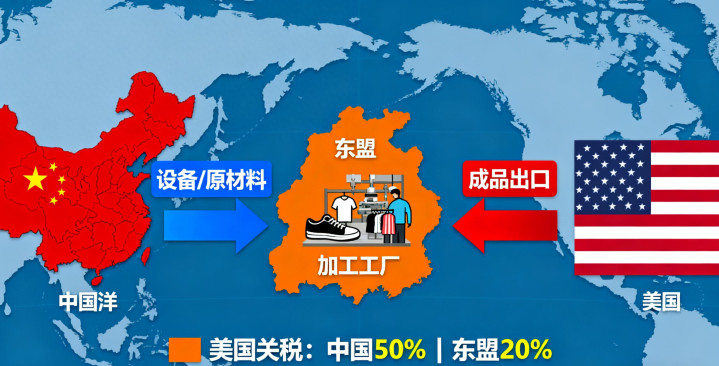 而 “最大赢家东盟”,则完美承接了全球产业链的 “中间环节”。中美之间的关税差是关键:美国对中国部分商品征收 50% 的关税,对东盟则仅收 20%,这让东盟成为 “中间加工枢纽”—— 中国将设备、原材料出口到东盟(如越南、印尼),东盟进行低端加工(如生产鞋子、衣服等消费品),再将成品出口到美国。