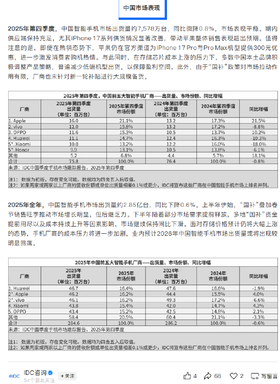 IDC表示,面对存储价格预计仍将大幅上涨的态势,手机厂商的成本压力将进一步加剧,业内预计2026年中国智能手机市场出货量或将出现较明显回落。